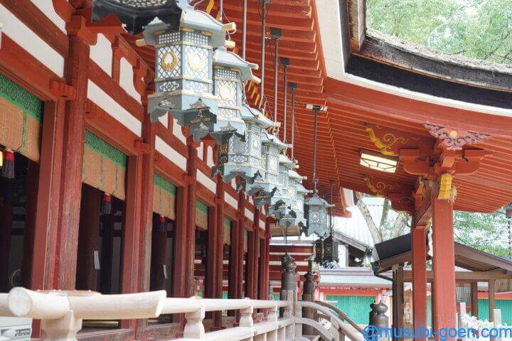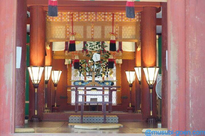 生産霊神(いくむすびのかみ・中央)・足産霊神(たるむすびのかみ・生産霊神の右)・魂留産霊神(たまつめむすびのかみ・生産霊神の左)・大宮能売神(おおみやのめのかみ・足産霊神の右)・御膳都神(みけつかみ・魂留産霊神の左)・辞代主神(ことしろぬしのかみ・右)・大直日神(おおなおびのかみ・左)
